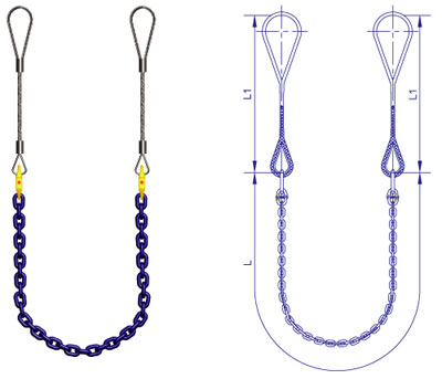 鋼絲繩索具與鏈條索具之間用相應(yīng)噸位的長吊環(huán)連接,鏈條與吊環(huán)之間可以用連接環(huán)連接也可以用鏈條卸扣連接。