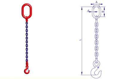 該索具可以作為單肢捆綁索具使用,當(dāng)單肢捆綁索具使用時只需將吊鉤鉤入鏈條,此時額定載荷將降低20%。