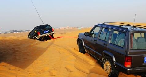 十一假期騰格里沙漠舉行了一年一度的阿拉善英雄會,來自全國各地的越野車愛好者在此歡聚。越野車雖然排量大,但是沙漠環境復雜很容易出現陷車,而吊裝帶則是沙漠汽車救援中的必須品。