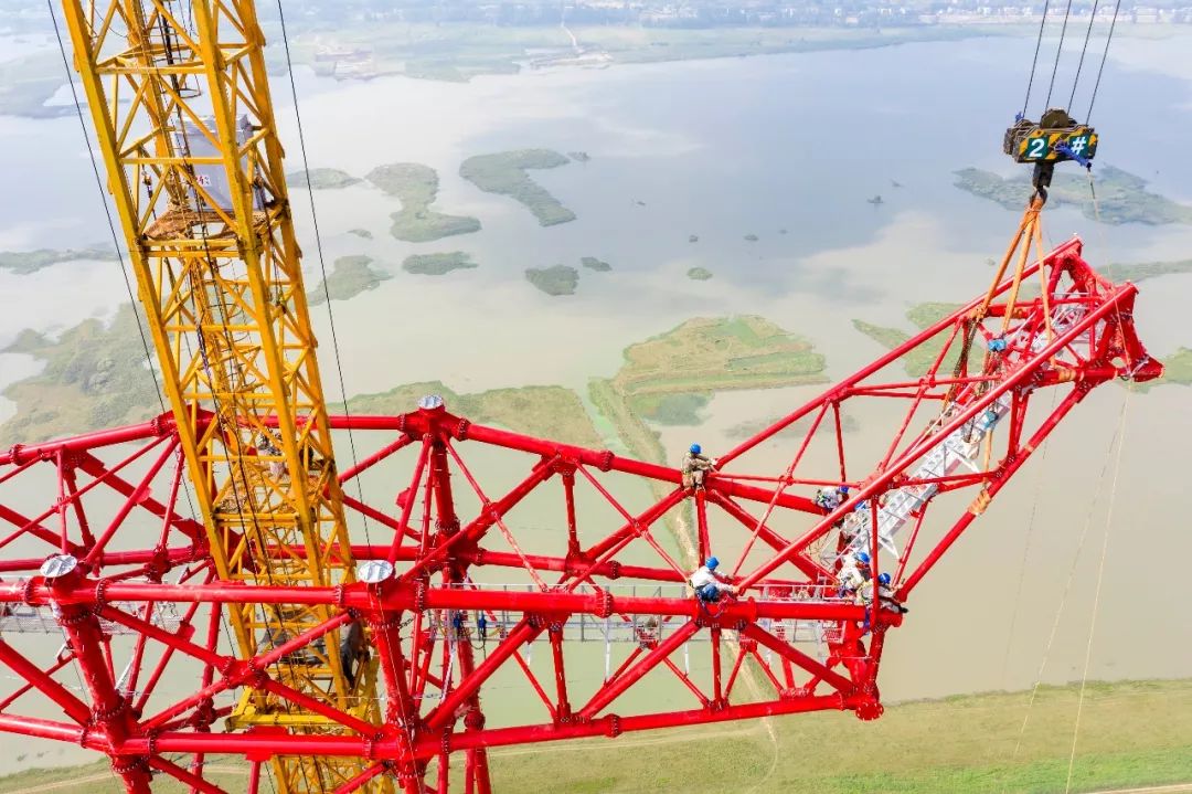 工程建設中最令人矚目的是跨越塔成功封頂,施工人員要在270多米高空中安裝500千伏淮河大跨越工程北岸跨越塔橫擔,跨檔距1918米,單座跨越鋼管塔重達1308噸、全高274.9米,需要大型起吊設備加上吊裝帶將其緩緩吊裝至指定位置,配合人力進行安裝。